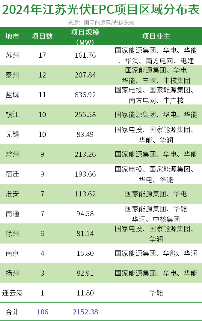 /光伏头条(PV-2005)统计,2024年上半年,江苏有108个光伏EPC项目定标,合计容量2702.38GW。