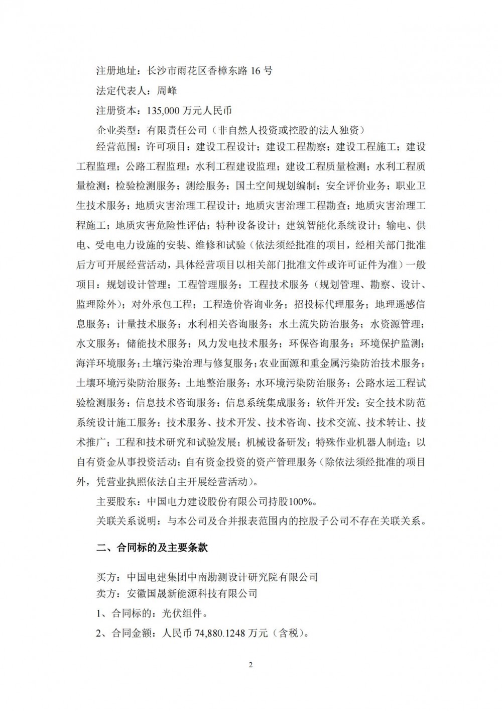 公告表示,近日,国晟世安科技股份有限公司(以下简称“公司”)二级控股子公司安徽国晟新能源科技有限公司与中国电建集团中南勘测设计研究院有限公司签订了《中广核莱州土山600MW盐光互补光伏发电项目工程EPC总承包工程光伏组件合同》(以下简称“合同”或“本合同”),合同金额为人民币74,880.1248万元。