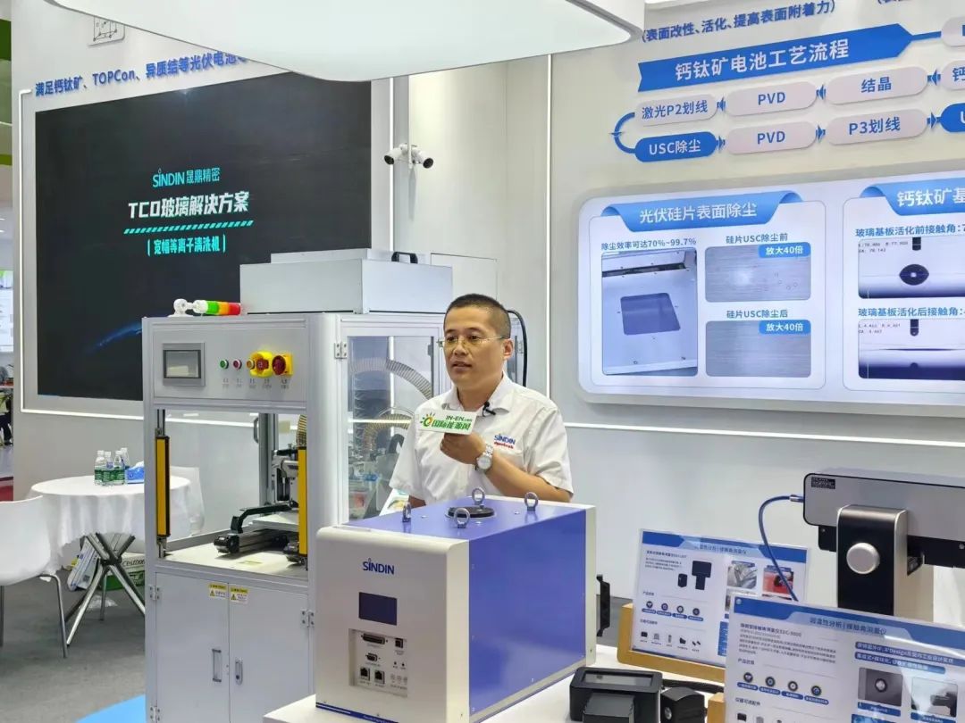 闫云朋表示,此次,晟鼎精密展出的等离子PLASMA+USC除尘一体化设备将宽幅等离子处理、USC干式除尘集为一体,不仅可以提高表面活性,增强附着性能,还可以使尘粒从玻璃基板表面分离出来,真正实现一机两用,用于光伏电池涂布、镀膜、粘接前,以达到表面活化、精细除尘的目的。
