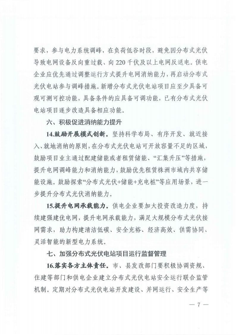 文件提出,鼓励开展模式创新。坚持科学布局、有序开发、就近接入、就地消纳的原则,在分布式光伏电站可开放容量不足的区域鼓励项目业主通过配建储能或者租赁储能、“汇集升压”等措施,提升电网调峰能力和消纳能力,鼓励优先租赁株洲市域内共享储能设施。鼓励探索“分布式光伏+储能+充电桩”等应用场景,进一步提升分布式光伏消纳能力。