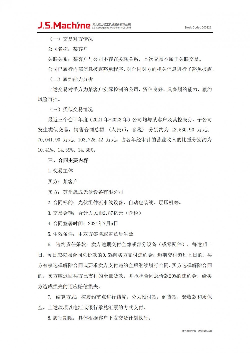 公告显示,近日,京山轻机之全资子公司苏州晟成光伏设备有限公司与光伏某龙头企业客户签署了日常经营销售合同,合同金额为人民币 2.87 亿元(含税),占京山轻机 2023 年度经审计营业收入的 3.98%,占晟成光伏 2023 年度经审计营业收入的 5.20%。根据公告披露,本次双反签订的合同标的为光伏组件流水线设备、自动包装线、层压机等。