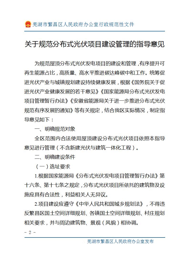 7月10日,安徽芜湖繁昌区人民政府办公室印发关于规范分布式光伏项目建设管理的指导意见。