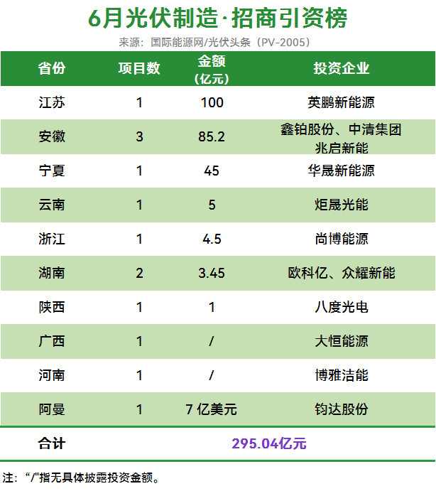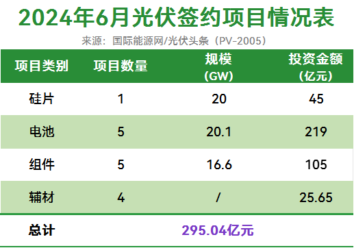 据/光伏头条统计,进入6月以后,总计13个光伏制造业项目签约,新增投资金额295.04亿元!