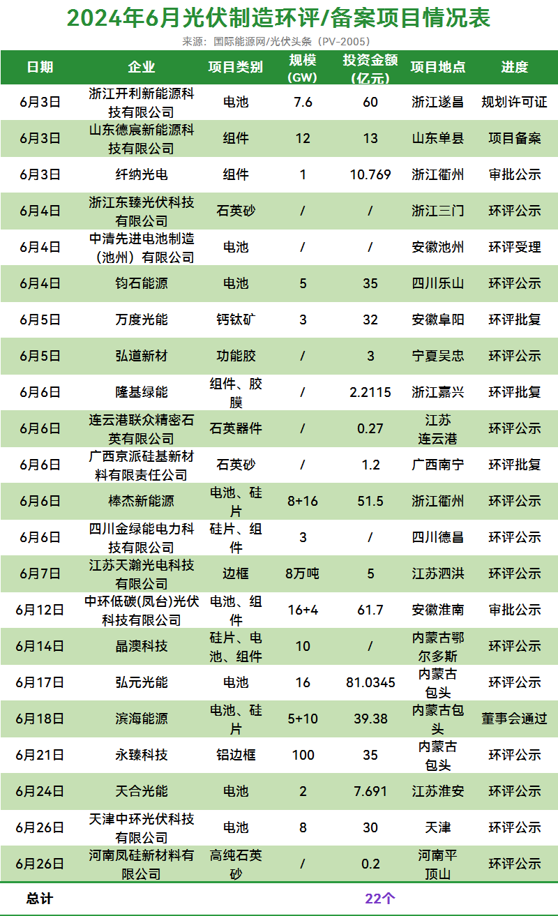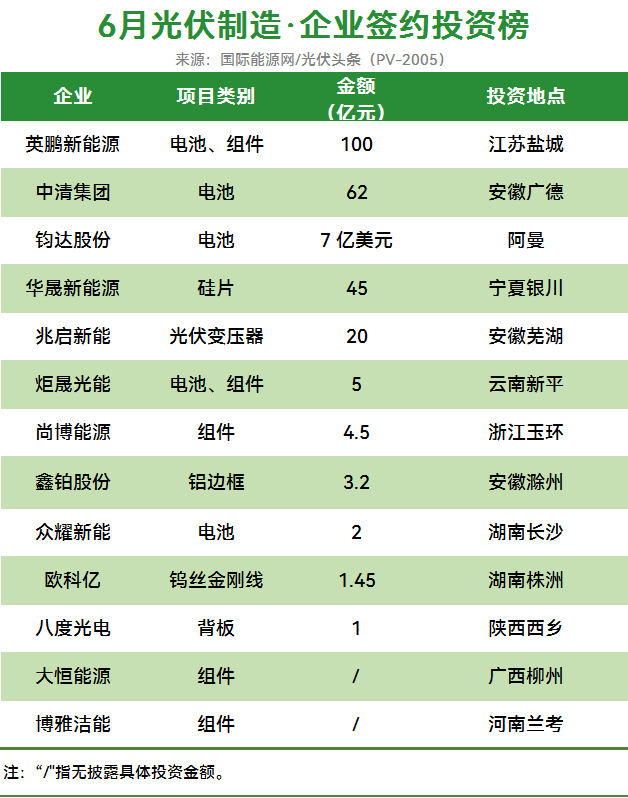 企业方面,英鹏新能源排名6月投资榜第一名。该企业计划在江苏盐城亭湖区环保科技城,投资100亿,建设10GW高效异质结电池和组件项目。