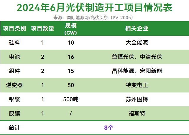 据/光伏头条统计,6月光伏制造业开工项目为8个,包括,1个多晶硅项目、2个光伏电池、2个光伏组件以及光伏逆变器、银浆、光伏胶膜项目。