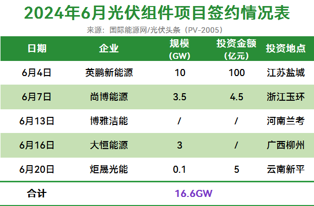 6月7日,总投资4.5亿元的尚博能源3.5GW组件项目签约浙江玉环市。此外,6月16日,大恒能源3GW组件项目在2024中国产业转移发展对接活动(广西)中签约。