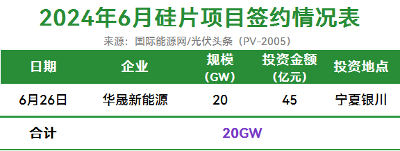 据/光伏头条(PV-2005)统计,6月签约硅片项目为华晟新能源20GW异质结专用单晶硅材料智慧工厂项目。该项目投资地点为宁夏银川市,项目总投资45亿元。