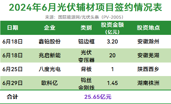 据/光伏头条(PV-2005)统计,6月有4个光伏辅材项目签约,合计新增投资25.65亿元,涉及企业包括鑫铂股份、兆启新能、八度光电、欧科亿。