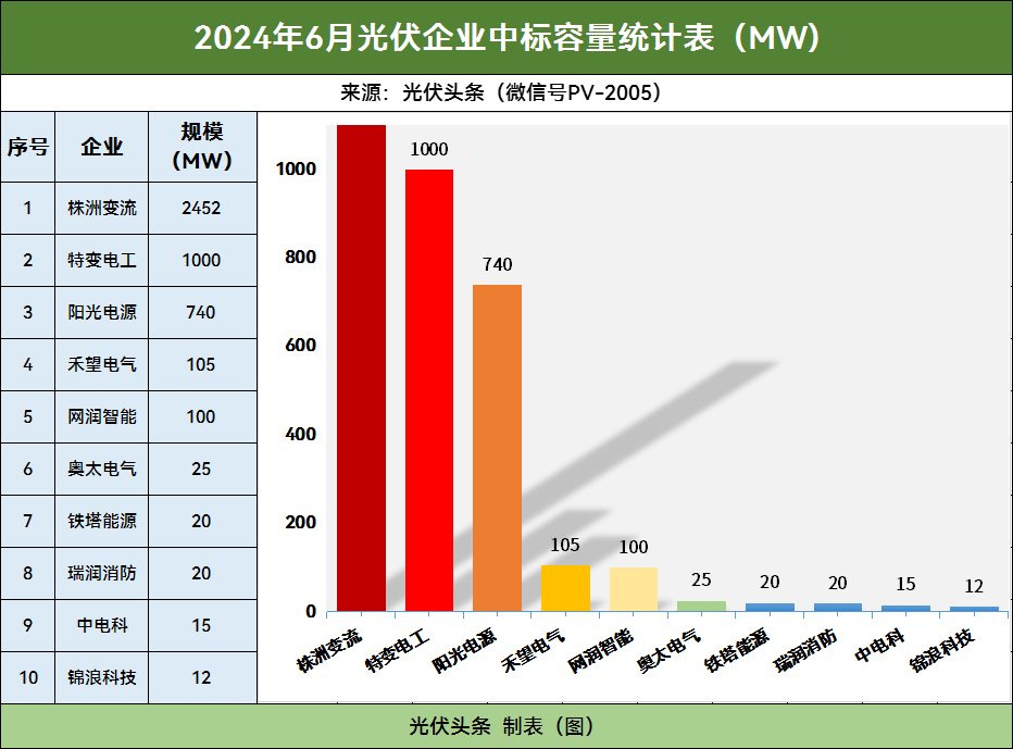 根据光伏头条(PV-2005)统计,除去数个集采项目未公布企业实际中标规模外,已确定中标容量项目,株洲变流中标2452W,排名榜首;特变电工中标1000W,排名第二;阳光电源中标740MW,排名第三。除此之外,禾望电气、西安网润智能科技有限公司、山东奥太电气、铁塔能源有限公司河北分公司、盐城市瑞润消防工程有限公司、中电科太力通信科技有限公司郑州分公司、锦浪科技等企业也位列6月逆变器中标榜前十。