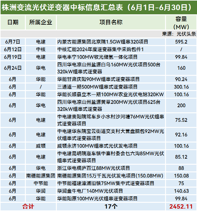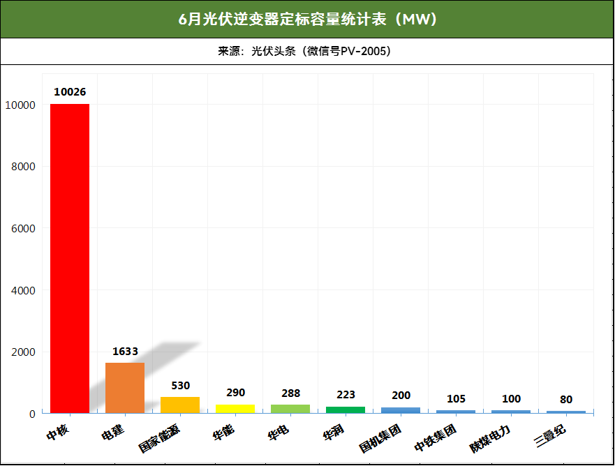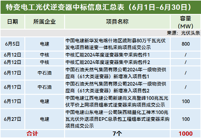 此外,6月,华能、华电、中节能均有项目定标,株洲变流成为最大赢家,包揽三家央企的逆变器招标项目。