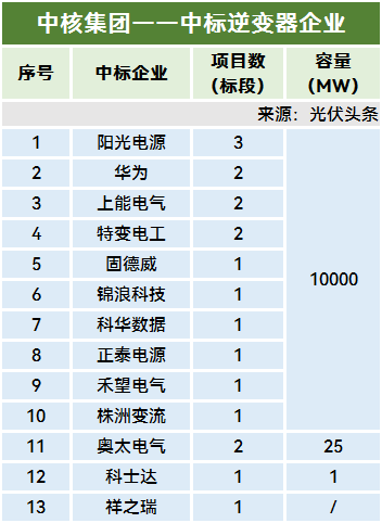 采购企业方面,中核、电建、国家能源集团、华能、华电、华润、国机集团、中铁集团、中国交建、南方电网、大唐、能建、中石油、中节能等14家央企均有逆变器采购项目定标。