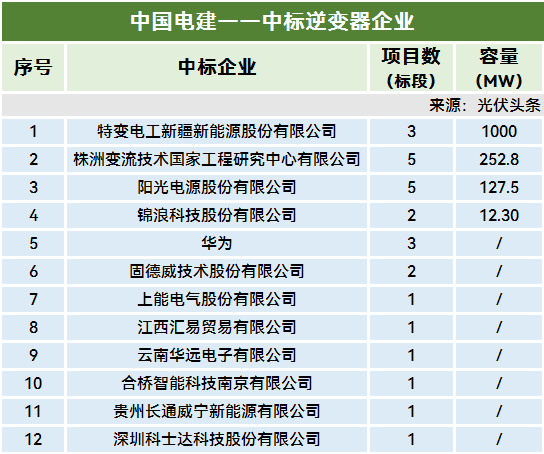 株洲变流、阳光电源是6月中国电建中标最多项目的逆变器企业,中标5个项目,中标容量分别为252.8MW、127.5MW。此外,锦浪、华为、固德威、科士达等企业均有斩获。
