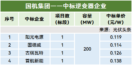 6月11日,国机中设新能源开发有限责任公司的中设新能源2024年度光伏逆变器框架入围集中采购项目确定了中标候选人,阳光电源、固德威、古瑞瓦特、首航新能4家逆变器企业入围,详情如下: