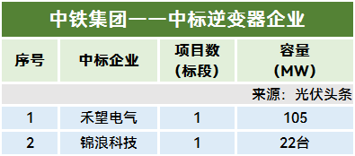 本统计周期,中铁集团有两个项目定标,禾望电气与锦浪科技分别中标。