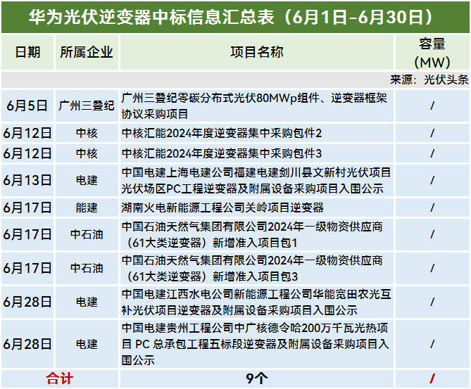 光伏头条(PV-2005)统计数据显示,6月,华为尽管中标项目未能确定中标容量,但中标数量以9个项目,排名第三。