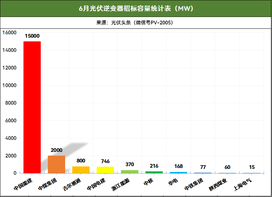 光伏头条(PV-2005)统计,6月光伏逆变器招标市场开始升温。中国能建、中煤集团、中国电建、浙江能源集团、中核、华电、中铁、陕西煤业、上海电气等企业发布了33个招标项目,合计容量约19.47GW。