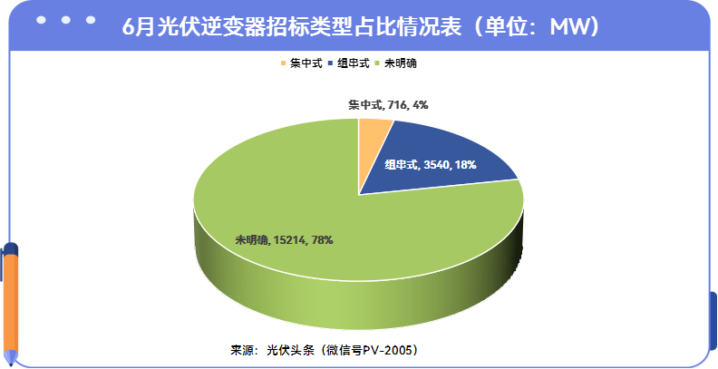 设备要求方面,光伏头条(PV-2005)统计数据显示,本统计周期组串式逆变器采购容量3540MW,占比18.18%。集中式逆变器采购容量716MW,占比为4%。由于中国能建15GW光伏逆变器采购项目未明确具体的各功率段光伏逆变器采购容量,因此6月多数光伏逆变器招标项目未明确设备类型。