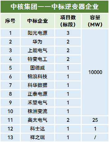 采购企业方面,中核、电建、国家能源集团、华能、华电、华润、国机集团、中铁集团、中国交建、南方电网、大唐、能建、中石油、中节能等14家央企均有逆变器采购项目定标。