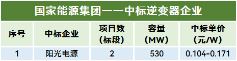6月,国家能源集团有两个项目定标,阳光电源成为最大赢家。其中国电电力综合能源内蒙古有限公司蒙西鄂尔多斯采煤沉陷区200万千瓦光伏发电项目箱逆变一体机设备采购公开招标项目,采购容量高达500MW,阳光电源排名第一中标人,投标报价折合0.171元/W。