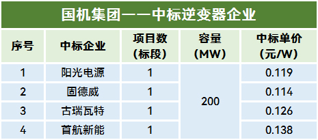 6月11日,国机中设新能源开发有限责任公司的中设新能源2024年度光伏逆变器框架入围集中采购项目确定了中标候选人,阳光电源、固德威、古瑞瓦特、首航新能4家逆变器企业入围,详情如下: