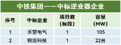 本统计周期,中铁集团有两个项目定标,禾望电气与锦浪科技分别中标。