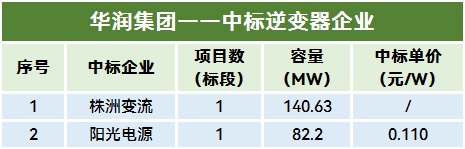 6月8日,华润广昌千善光伏发电项目组串式逆变器设备采购项目确定了中标人,阳光电源最终中标,中标单价为0.11元/W。此外,株洲变流中标华润金牛电厂140MW光伏项目。