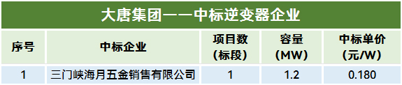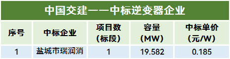 本统计周期,中国交建有一个项目定标。该项目采购36-250kW之间组串式逆变器,容量19.582MW。盐城市瑞润消防工程有限公司作为第一中标候选人,中标单价为0.185元/W。
