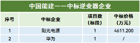 6月,中国能建有两个项目定标,阳光电源与华为两大逆变器巨头分别中标。其中,阳光电源中标蒙西鄂尔多斯光伏项目逆变器采购,中标金额高达4611.2万元,由此推测该项目招标容量在400MW左右。