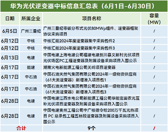 本统计周期,华为中标中核、电建、能建、中石油、广州三叠纪零碳技术发展有限公司等企业9个项目(标段)。