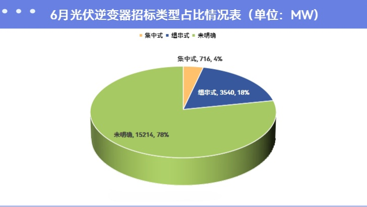 此外,中国中煤能源集团有限公司2024年度第一批1500V组串式逆变器(196kW及以上)框架集中采购项目也于6月发布。该项目采购容量2GW,储备容量1GW设备要求196kW及以上组串式逆变器。设备要求方面,统计数据显示,本统计周期组串式逆变器采购容量3540MW,占比18.18%。集中式逆变器采购容量716MW,占比为4%。由于中国能建15GW光伏逆变器采购项目未明确具体的各功率段光伏逆变器采购容量,因此6月多数光伏逆变器招标项目未明确设备类型。