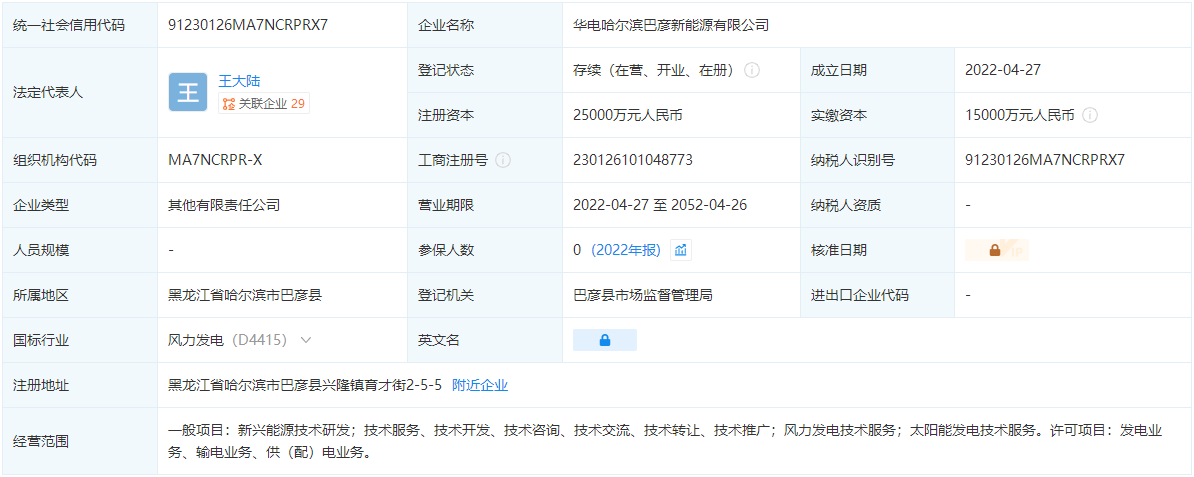 新能源圈从企查查了解到,4月28日,华电(哈尔滨)新能源有限公司成立,法定代表人为郑勇斗,注册资本1000万人民币,经营范围含新兴能源技术研发、风力发电技术服务、太阳能发电技术服务、储能技术服务等。该公司由华电能源(600726)全资持股。