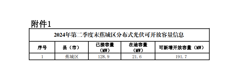 2024年第二季度末蕉城区分布式光伏已接容量128.9MW,在途容量21.6MW,可新增开放容量191.7MW。