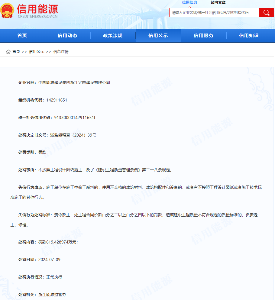 信用能源官方网站显示,中国能源建设集团浙江火电建设有限公司不按照工程设计图纸施工,违反了《建设工程质量管理条例》第二十八条规定。失信行为事项为:施工单位在施工中偷工减料的,使用不合格的建筑材料、建筑构配件和设备的,或者有不按照工程设计图纸或者施工技术标准施工的其他行为。