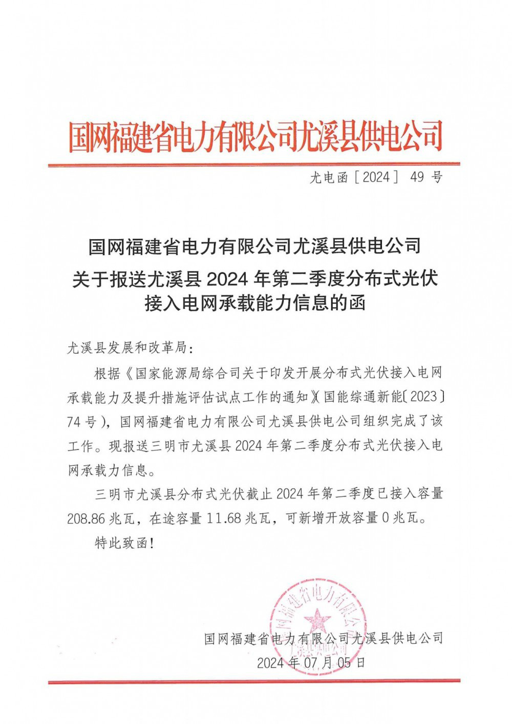 2024-04-30 7月23日,尤溪县发展和改革局发布关于尤溪县2024年第二季度分布式光伏接入电网承载力信息的复函,原则同意国网福建省电力有限公司尤溪县供电公司测算汇总的尤溪县供电区域内截至2024年第二季度分布式光伏接入可新增开放容量为0兆瓦。在后续分布式光伏发电项目备案时,尤溪县发展和改革局将加强与贵公司信息沟通,有序引导项目单位开展分布式光伏接入申请有关事宜。