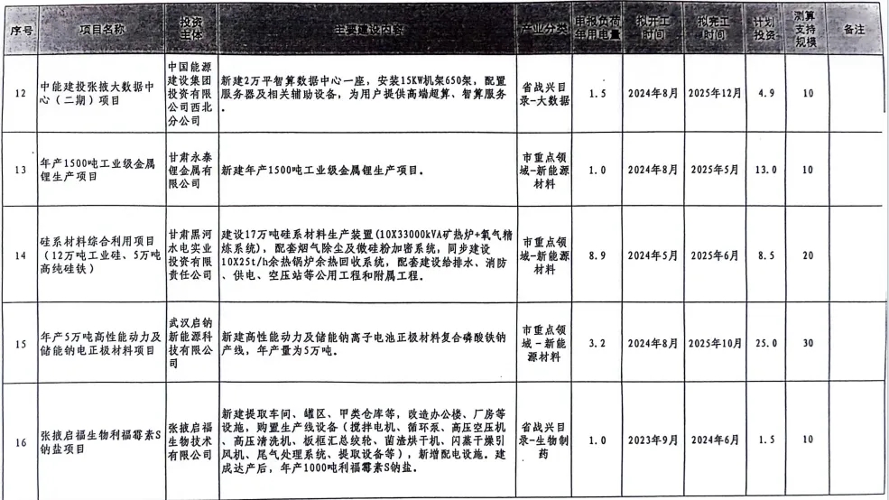 2024-04-30 近日,甘肃省张掖市发改委发布了《关于首批新增负荷项目入库的通知》,根据测算拟支持的新能源规模总计达7.5GW。从项目清单来看,主要为各类风光制氢氨项目,同时也包括数据中心、风光储智能制造等,总计36个项目。