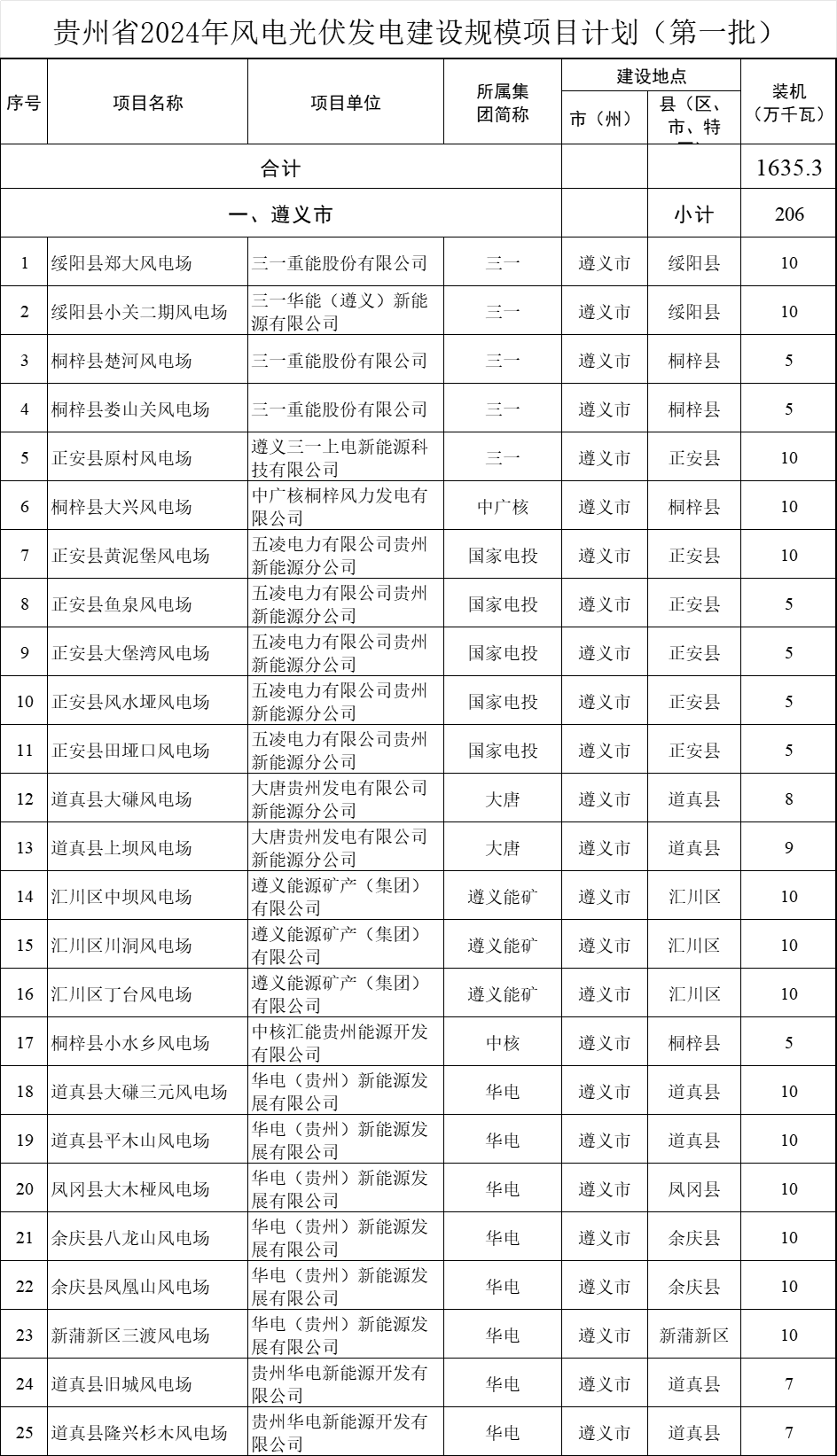 贵州省能源局关于下达贵州省2024年度风电光伏发电建设规模项目计划 (第一批)的通知