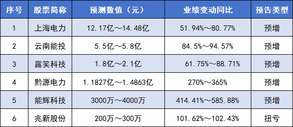 截至目前,上海电力、云南能投、露笑科技、黔源电力、能辉科技、兆新股份共计6家光伏电站开发企业发布2024年中业绩预告,并成为今年上半年光伏上市公司中的净利增长领头羊。