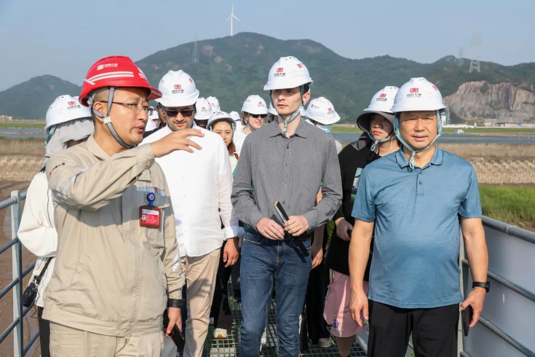 随后,外宾代表和记者团一行来到栈桥区域,俯瞰电站全貌,光伏板排列有序,一起“沐浴”着阳光,直面感受“大国重器”的魅力。在栈桥上,大唐浙江新能源公司负责人回答了外宾代表关于光伏组件最佳倾角、利用小时数、发电量、光伏支架防潮防腐处理、逆变器保护等专业技术问题。