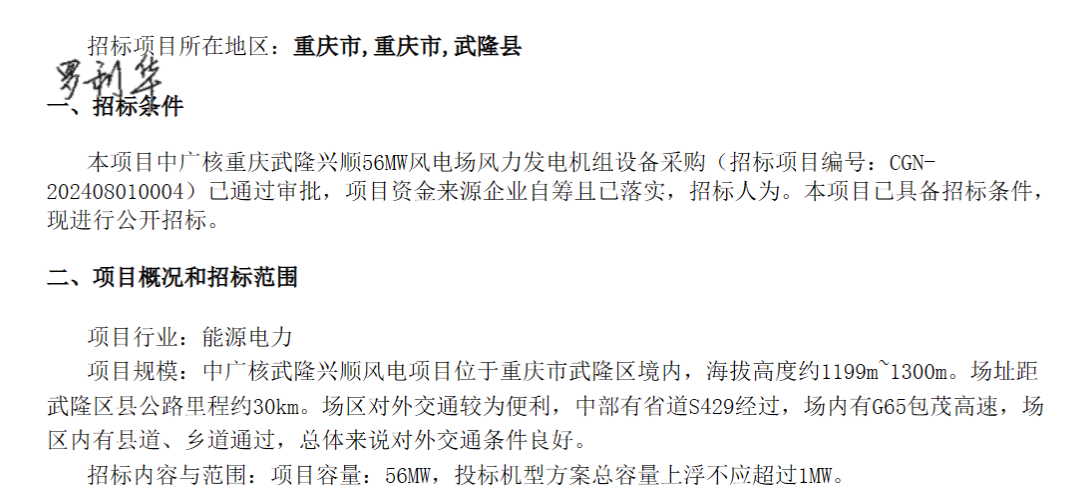 2024-04-30 8月6日,中广核电子商务平台发布中广核重庆城口旗杆山100MW陆上风电项目、中广核重庆城口月亮坪40MW陆上风电项目、中广核重庆武隆兴顺56MW风电场风力发电机组设备采购招标公告。