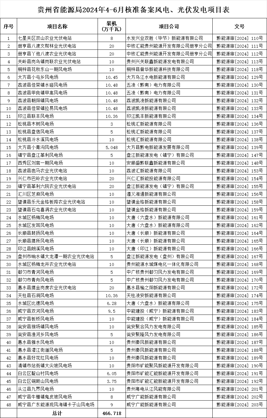 根据《省人民政府关于印发贵州省企业投资项目核准和备案管理办法的通知》(黔府发〔2018〕第7号),按照程序,贵州省能源局2024年4-6月核准备案风电、光伏发电项目48个,总装机466.718万千瓦,现将有关情况公布如下。