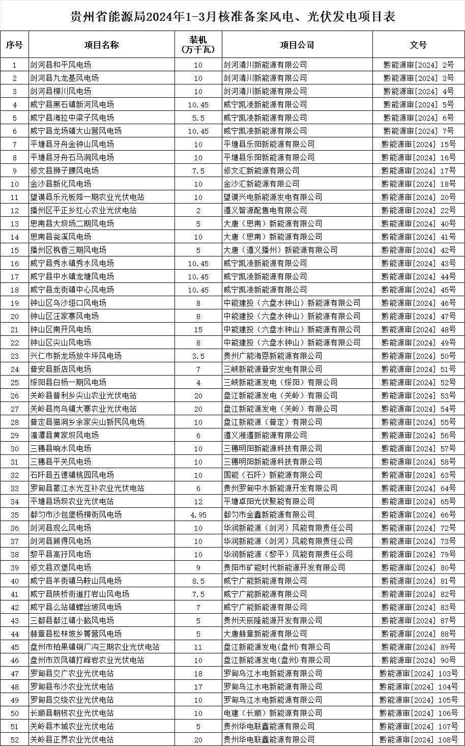贵州省能源局2024年1-3月核准备案风电光伏发电项目情况