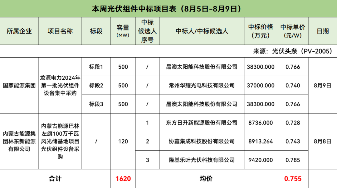 本周国家能源集团、内蒙古能源集团林东新能源有限公司组件中标项目有明确中标价格,合计规模1620MW,中标均价为0.755元/W。