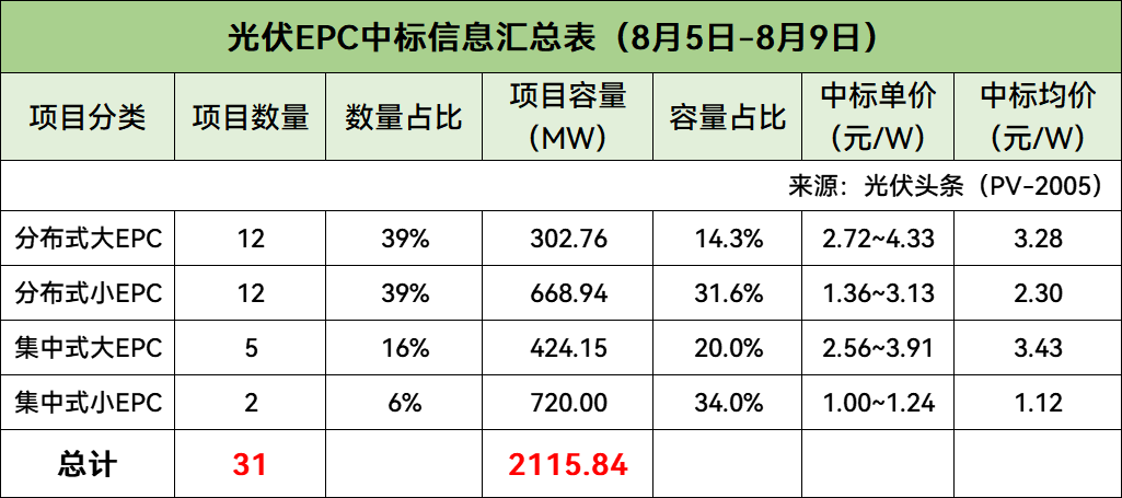 对8月第1周(8月5日-8月9日)光伏EPC招/中标项目不完全统计,本周招标规模合计2611.46MW,中标规模合计2115.84MW,招中标规模合计4727.30MW。
