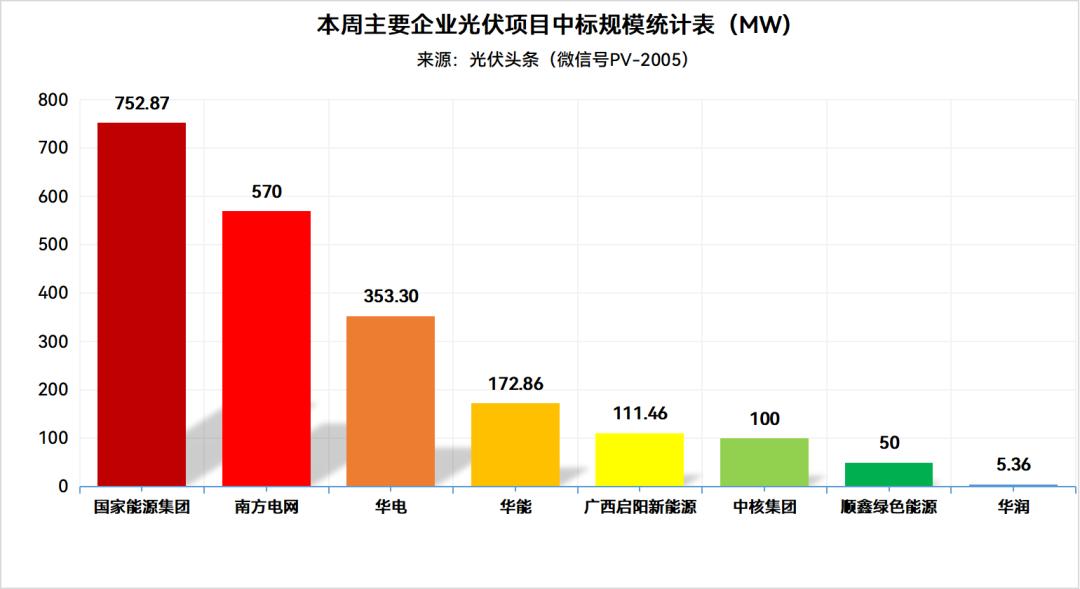 统计本周国家能源集团、南方电网、华电、华能、中核集团、华润等企业发布了31个中标项目,总规模2115.84MW。其中,国家能源集团以752.87MW位列第一,南方电网以570MW排名第二,华电以353.30MW位列第三。