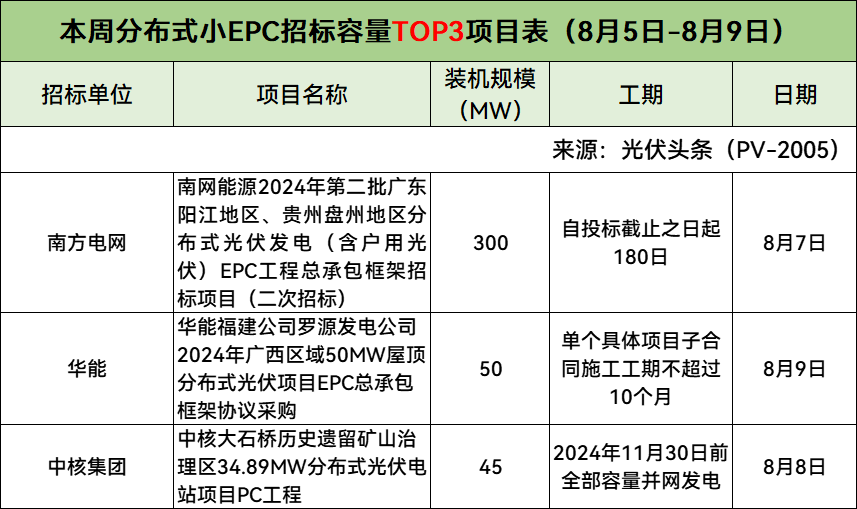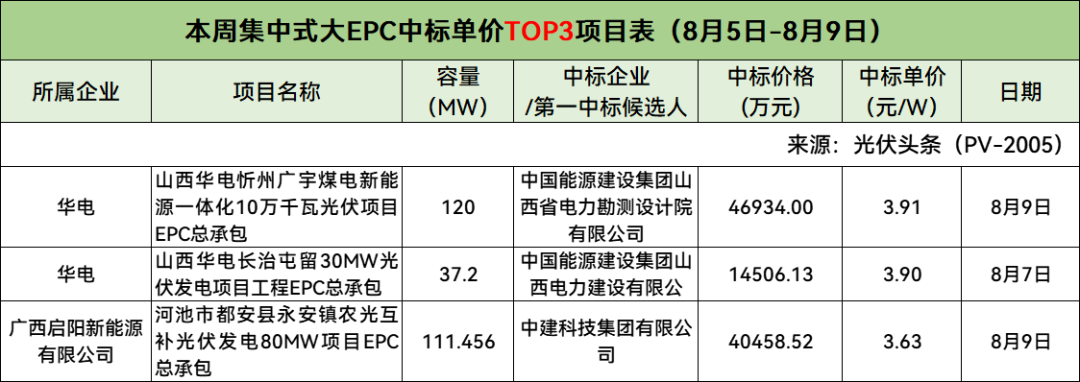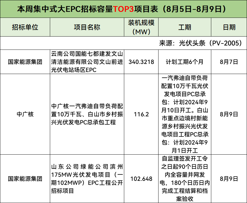 5个集中式大EPC项目,均价3.43元/W