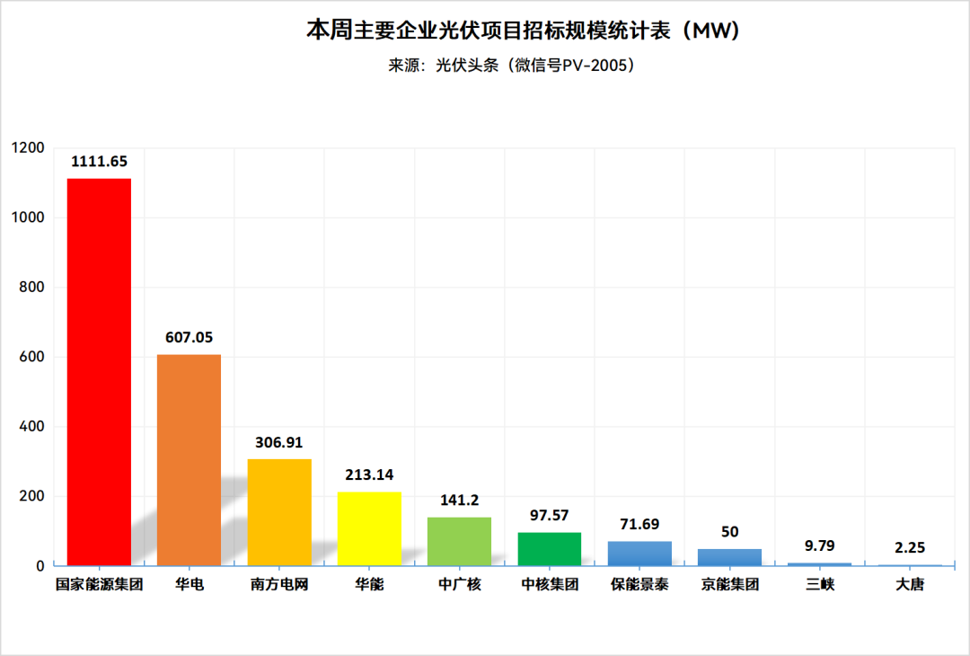 统计,本周国家能源集团、华电、南方电网、华能、中广核、中核集团、三峡、大唐、京能集团等企业发布了57个光伏招标项目,装机规模合计2611.46MW。