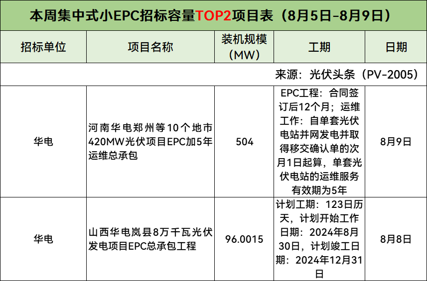 本周集中式大EPC中标单价最高项目是山西华电忻州广宇煤电新能源一体化10万千瓦光伏项目EPC总承包。项目交流侧100MW(直流侧120MWp),配置储能电站20MW/40MWh。项目招标内容包含勘察设计、设备材料采购、建筑安装工程等。其中建筑安装工程含220kV升压站工程、集电线路工程、光伏阵区、储能电站工程施工、道路工程(含场内检修道路、临时道路、施工便道等)、原忻州广宇电厂#4机组发电机-变压器-线路组屋外配电装置拆除、设备安装调试、试验(一、二次设备安装、调试及试验、涉网试验)、验收、并网发电。