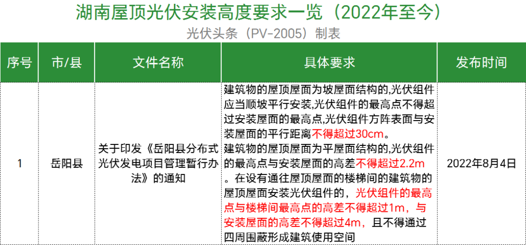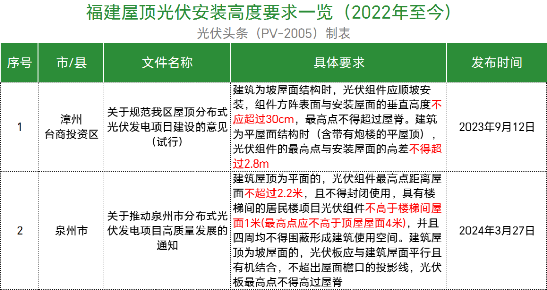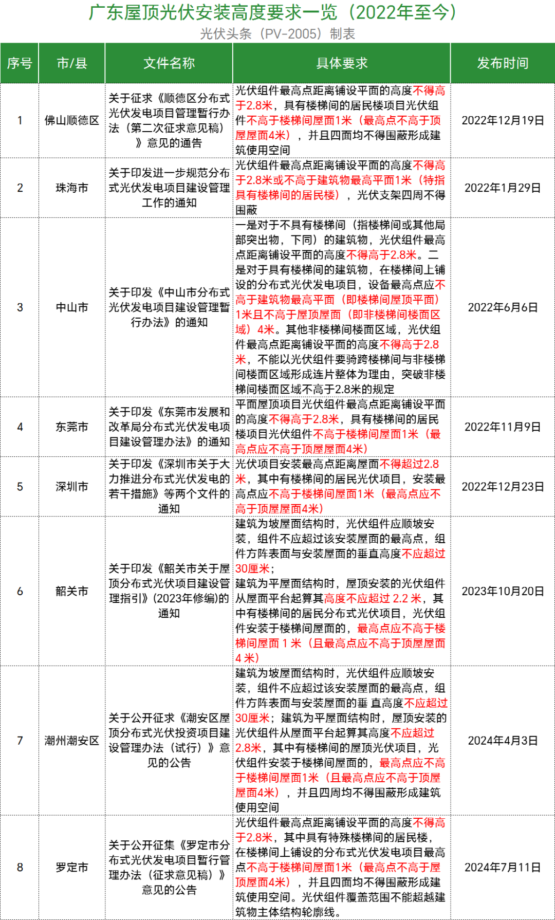 此外,广东珠海市、广东中山市、广东东菀市、广东深圳市、广东潮州潮安区、广东罗定市等均规定光伏项目安装最高点距离屋面不得超过2.8米,有楼梯间的居民分布式光伏项目,光伏组件安装的最高点应不高于楼梯间顶平面1米。