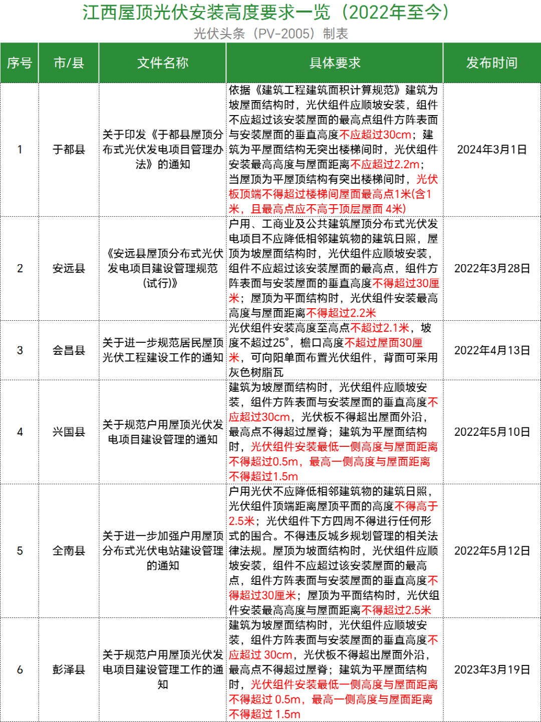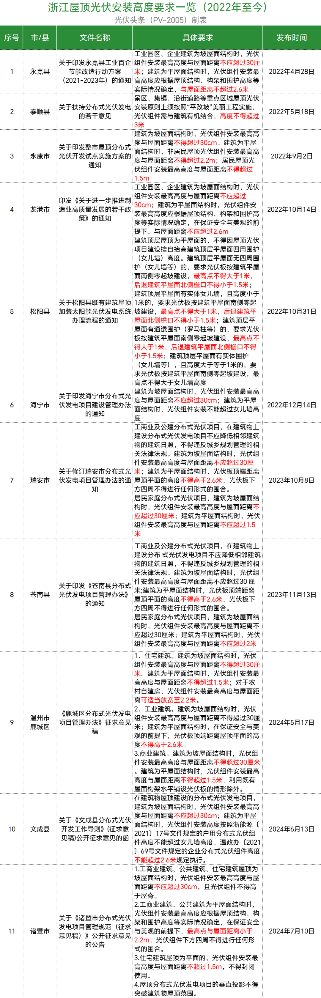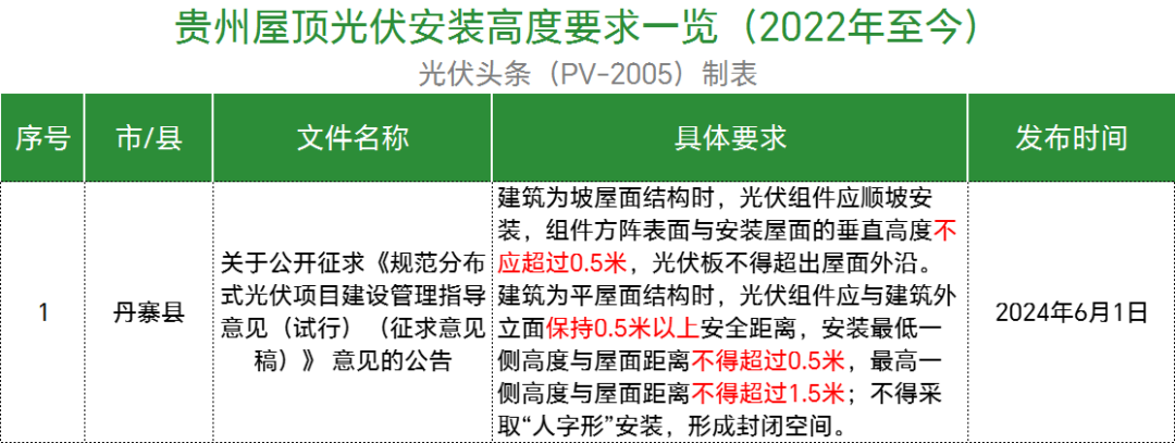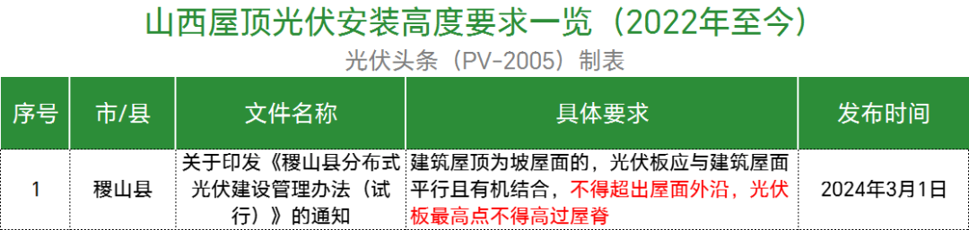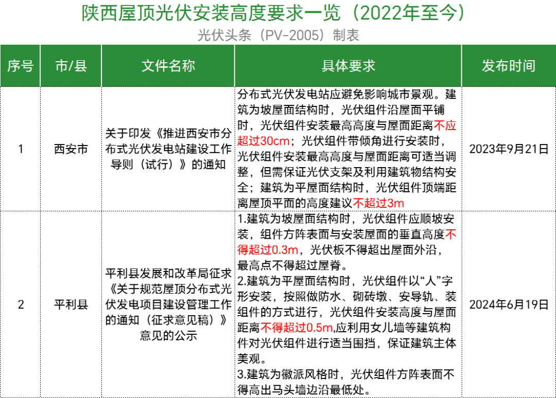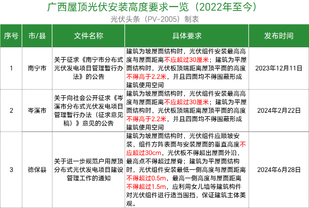 梳理后发现,规定建筑为坡屋面结构时,组件方阵表面与安装屋面的垂直高度不应超过30cm的有湖北通山县、湖南岳阳县、陕西西安市、江西于都县、江西安远县、江西兴国县、江西全南县、江西彭泽县、广东韶关市、广东潮州潮安区、浙江永嘉县、浙江苍南县、浙江瑞安市、浙江永康市、浙江龙港市、浙江海宁市、广西南宁市、广西岑溪市、广西德保县、江苏镇江市、陕西平利县、浙江温州市鹿城区、浙江文成县、浙江诸暨市等地。