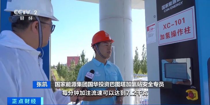 国家能源集团国华投资巴图塔加氢站安全专员 张凯:这台加氢机采用了先进的控制策略,每分钟加注流速可以达到7.2千克,是传统行业加氢站的两倍,同时这台加氢机仅用30分钟,就可以将一辆氢能火车加注满。